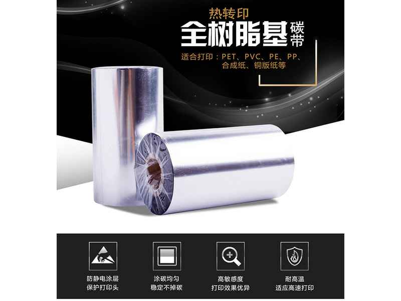 混合基碳带——材料上乘,保证质量 产品特点: 耐磨擦、耐腐蚀性能,具有广泛的应用领域。 高度分辨率适合打印标准及旋转条型码。 能满足不同被打印材质的需求。 高敏感度确保优异的打印效果。 防静电背涂层,有效保护打印头。防静电背涂层易于有效保护打印头。